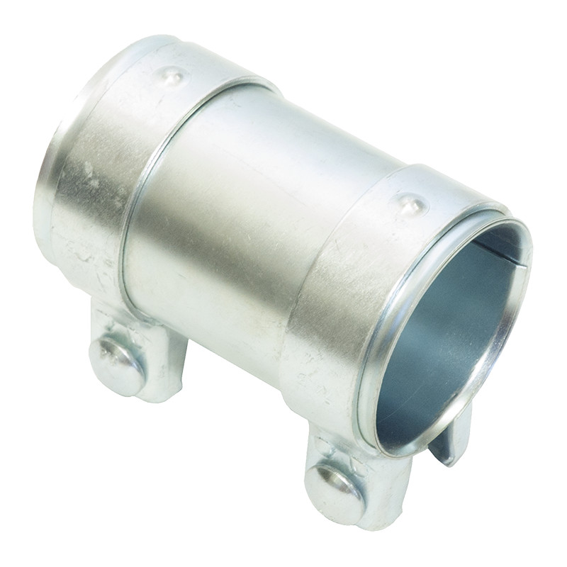 Le corps cylindrique du manchon vient coiffer les deux extrémités de tube à assembler. La jonction est ensuite verrouillée grâce à deux colliers de serrage intégrés, chacun équipé d'un boulon à tête hexagonale. Ce système de double fixation répartit uniformément la pression de serrage sur toute la périphérie du tube, garantissant une étanchéité aux gaz fiable et une tenue mécanique résistante aux vibrations du moteur et de la route.